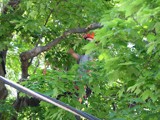 There were old broken cables holding the three trunks together. They think they were dated more years than one would believe. There are still three screws holding the three trunks together closer to the base of the tree, they think these are dated after the broken cables - or at least long enough ago that the tree has grown around them. Now it has been cabled with three cables much higher in the tree. There was lots of purning to keep branches that we thought were too close to our neighbor, and any dead branches. Luckily our neighbors were thrilled with the results - as we heard from the tree guys. It is an amazingingly tall maple tree. I think next year we will just have to see if we can tap any sap from it for syrup.